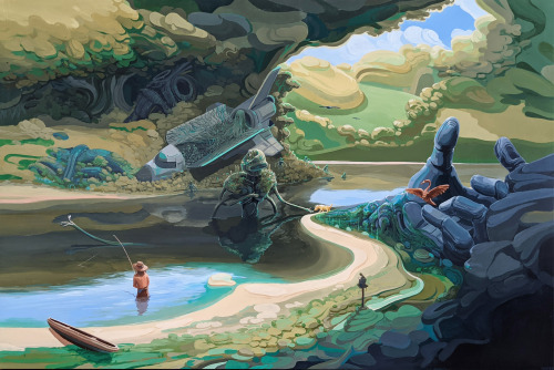 Through painting and sculpture, we explore the possible future reality. Seeing what may become of our world when the role of custodian passes to new forms of life. Some which may have evolved from our own technology and industrial ways, and others which still carry on from the prehistoric age.